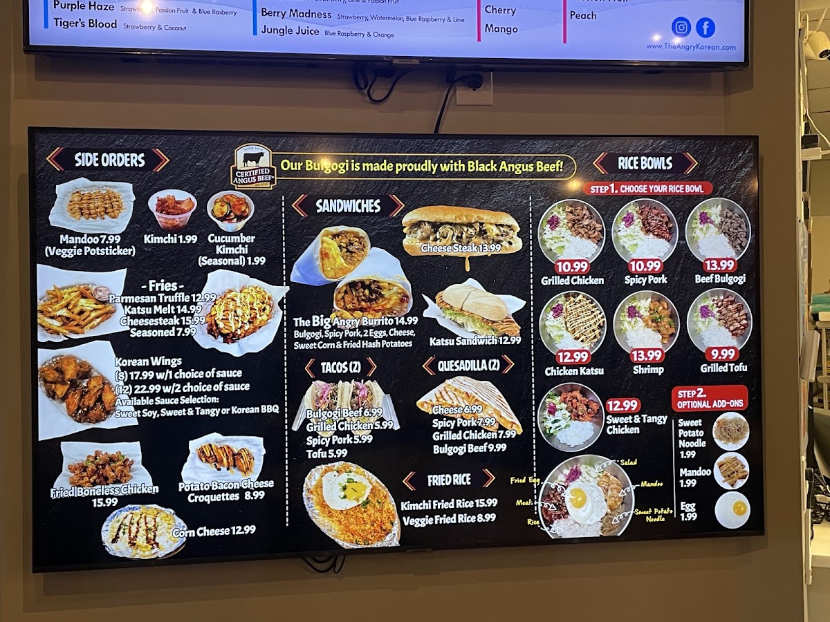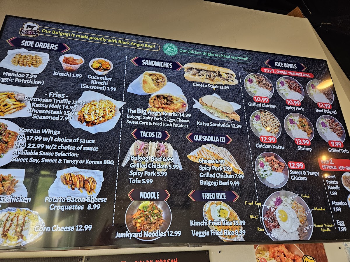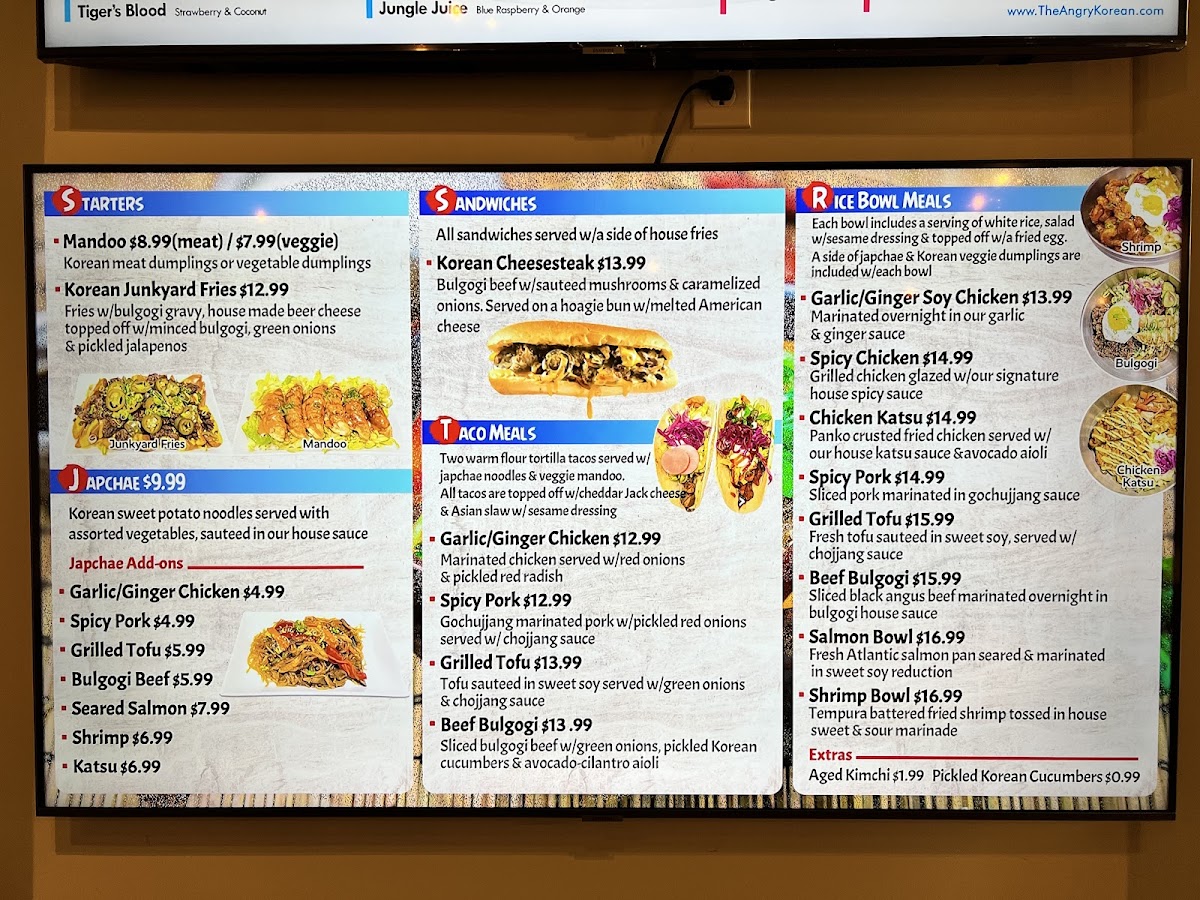 An original favorite back when The Angry Korean was a food truck. Two flour tortillas pressed on a grill with burnt Mozz. cheese, choice of protein and topped off with house pickled red onions and salsa. Served with a side of Japchae noodles and Korean dumplings.