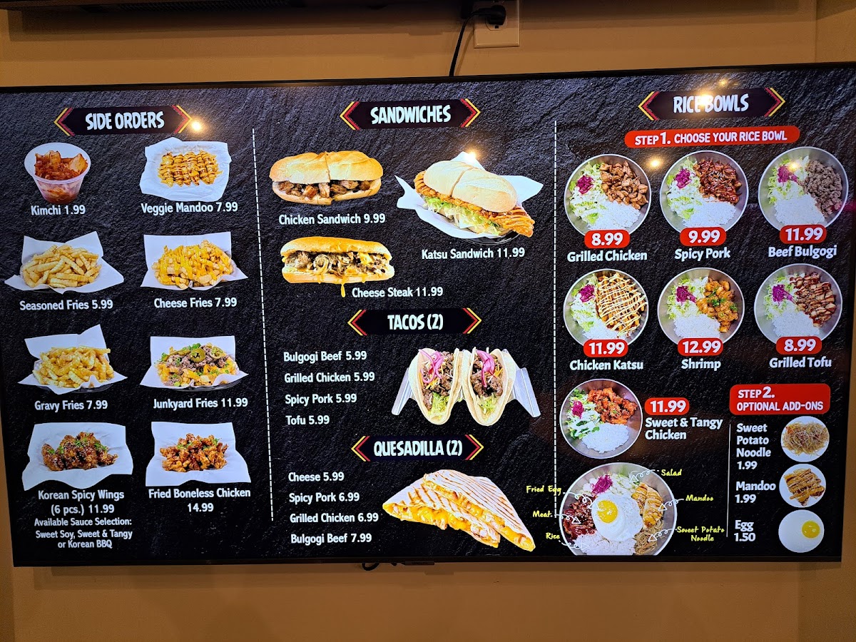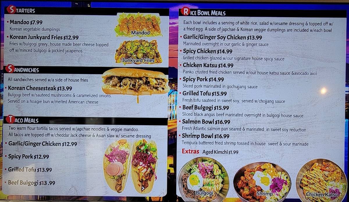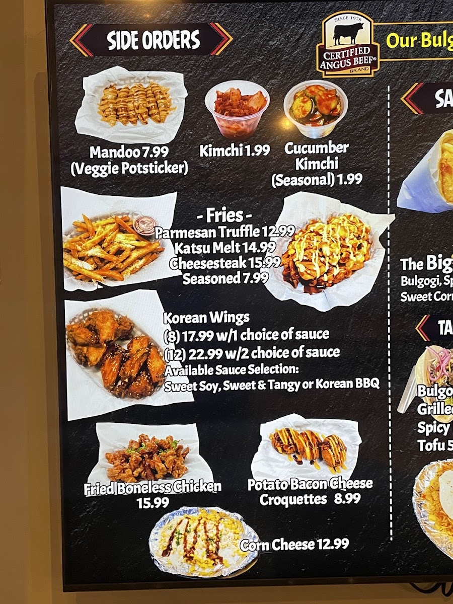 Our famous Korean cheesesteak, cooked to order with our award winning beef Bulgogi served in a warm hoagie bun with melted American cheese, sauteed mushrooms and caramelized onions.